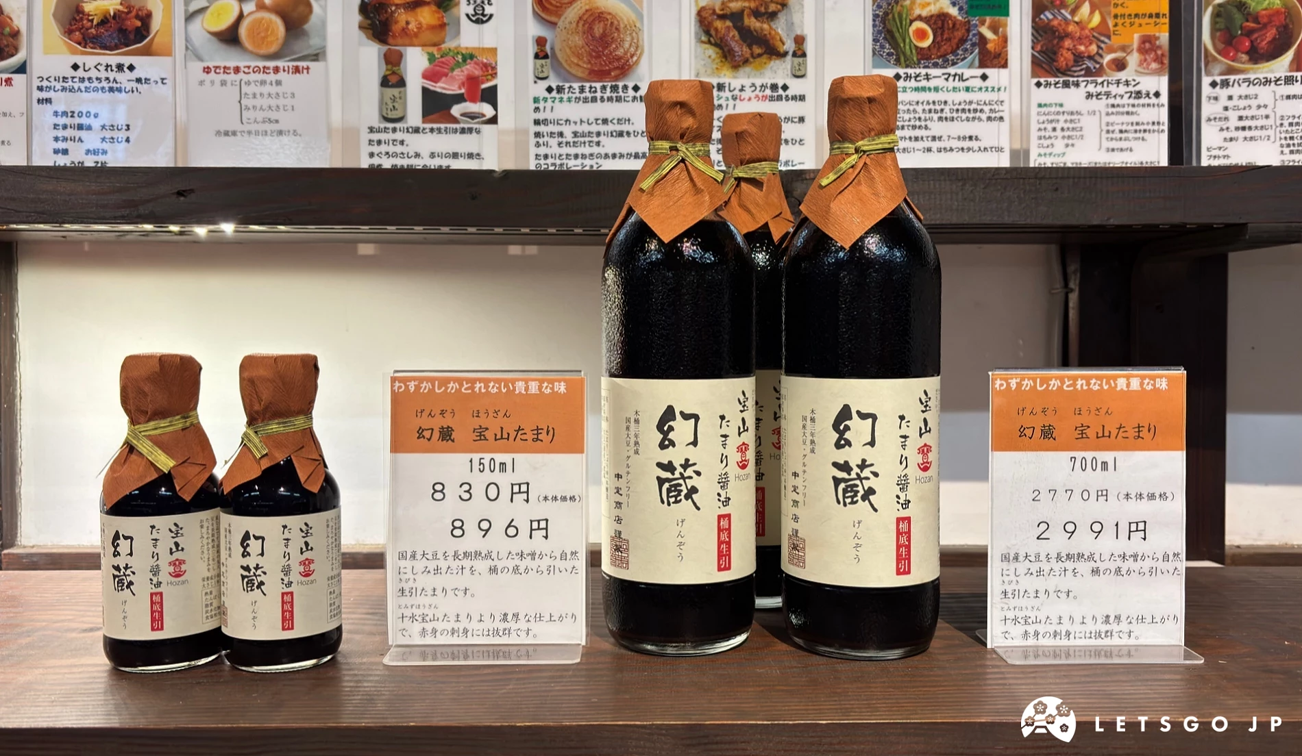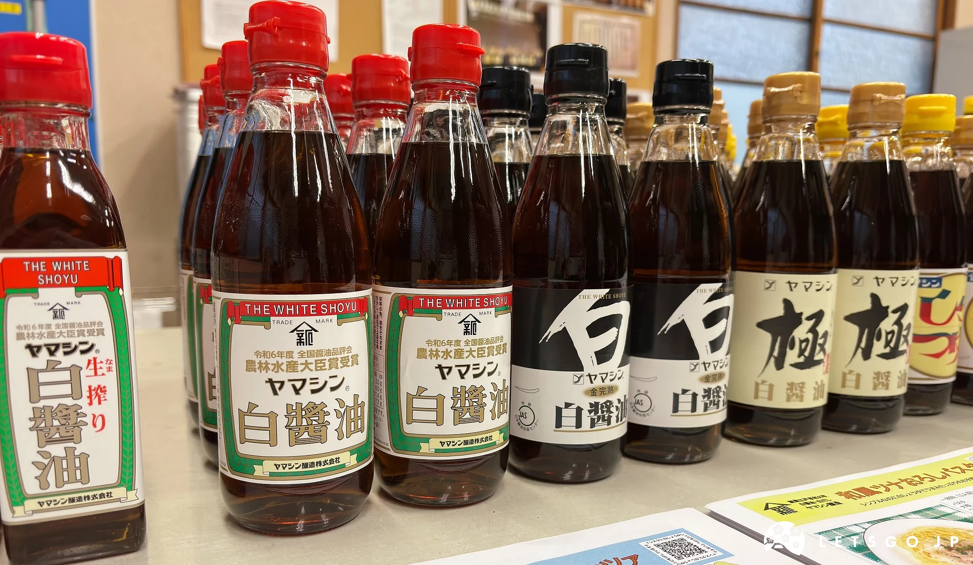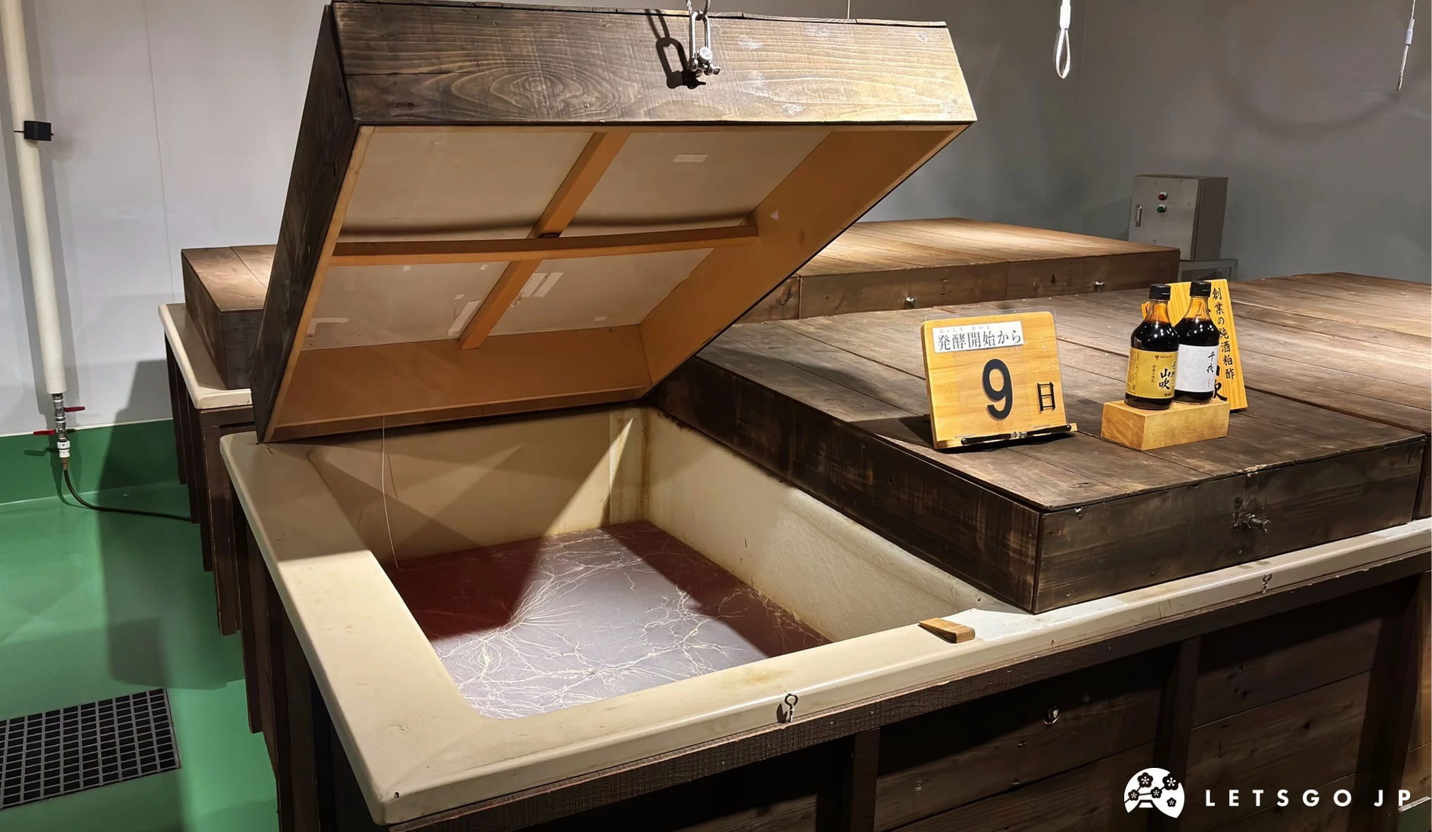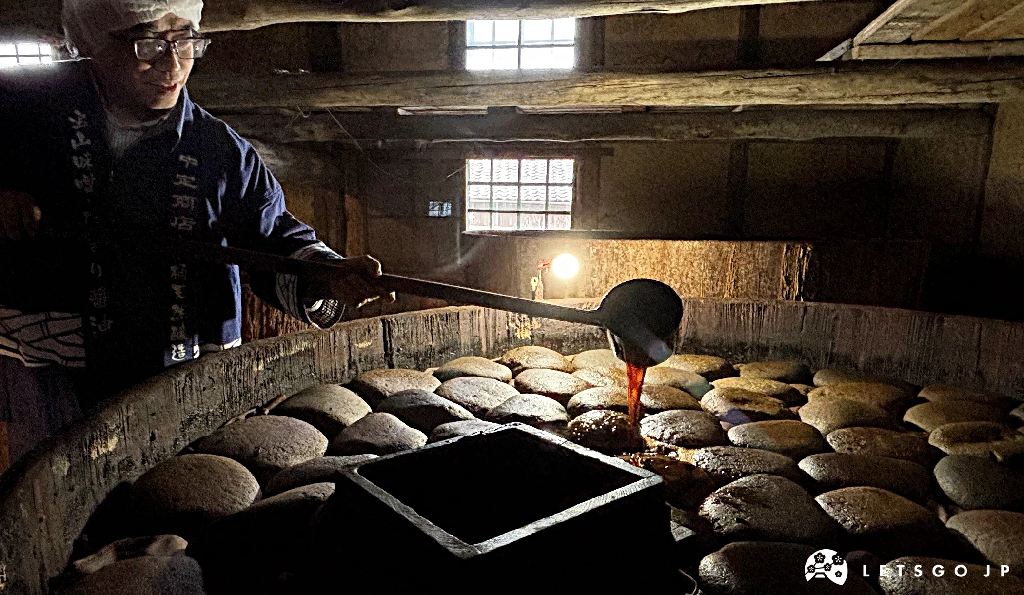 溜醬油的誕生與豆味噌息息相關,據說是在製作豆味噌的過程中自然滲出液體,這些液體沉澱在木桶底下,取出後用來製作溜醬油。溜醬油僅用大豆和鹽水製成,把蒸熟的大豆搓成團狀,表面附著麴菌製成豆麴,接著和鹽水混合後放入大型木桶中,以河川石頭封蓋,經過三年的時間發酵而成。特有的工序是「舀、澆」,用勺子舀起溜醬油,從石頭上方反覆澆回。參觀之後可到直營商店「本藏」試吃四種不同濃度與風味的溜醬油,比較差異,找到自己最喜歡的一款。