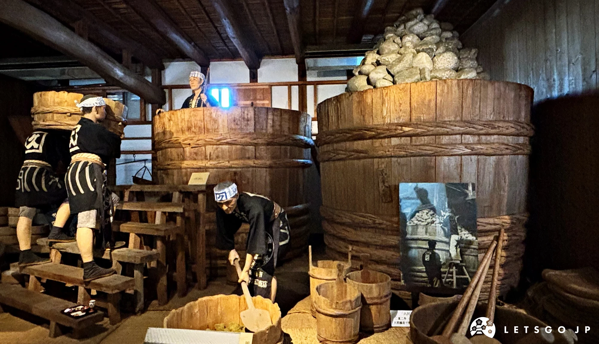 來到「KAKUKYU八丁味噌(八丁味噌之鄉)」可免費參觀由舊味噌藏改建的史料館,部分時段還有專人導覽、解說,能深入了解八丁味噌的製程與歷史。尤其是使用大木桶與金字塔形石堆壓蓋的傳統釀造方式,以及進入倉庫後濃郁的味噌香氣,都讓人留下深刻印象。