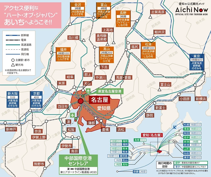 愛知縣交通四通八達,從東京或大阪前往都十分便利。東海道新幹線連結名古屋,從東京約1.5小時、從大阪約1小時即可抵達。中部國際機場則提供多國航班與快速鐵路直達市區。無論是長途移動或縣內觀光,都能快速順暢,是旅遊最佳據點!