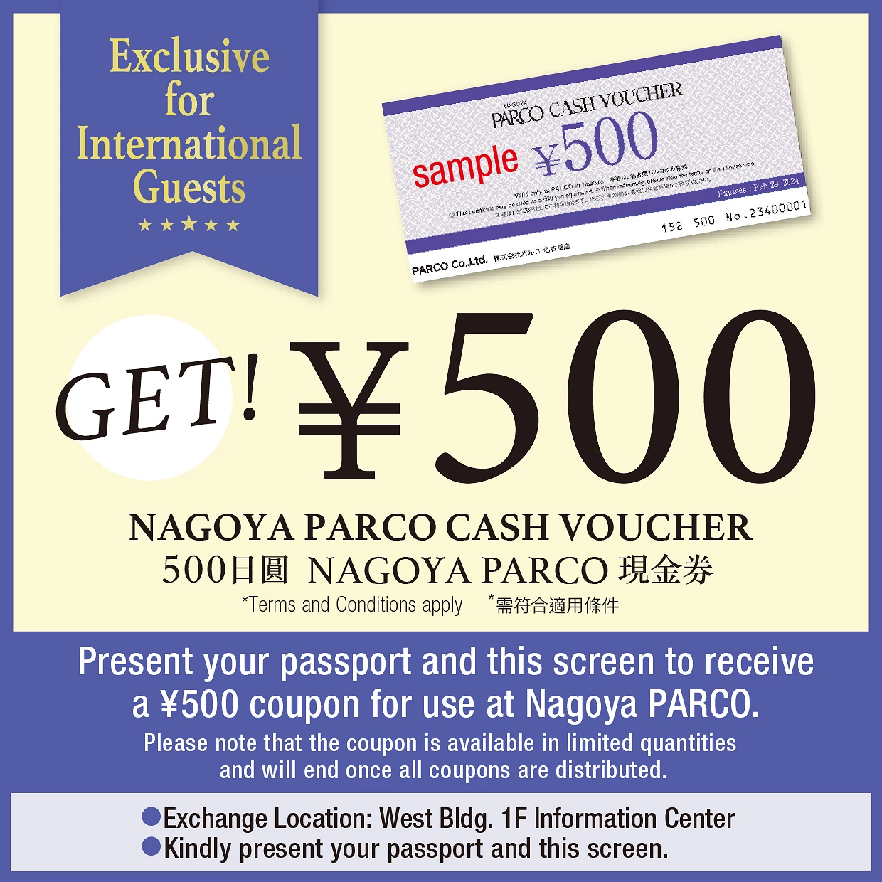 ※ インフォメーションカウンターにスマートフォンでクーポン画面とパスポートの提示で500円分のバウチャーお渡し